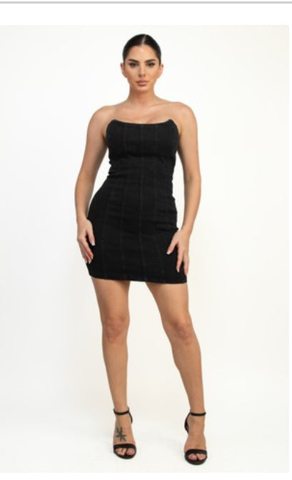 strapless black denim mini dress